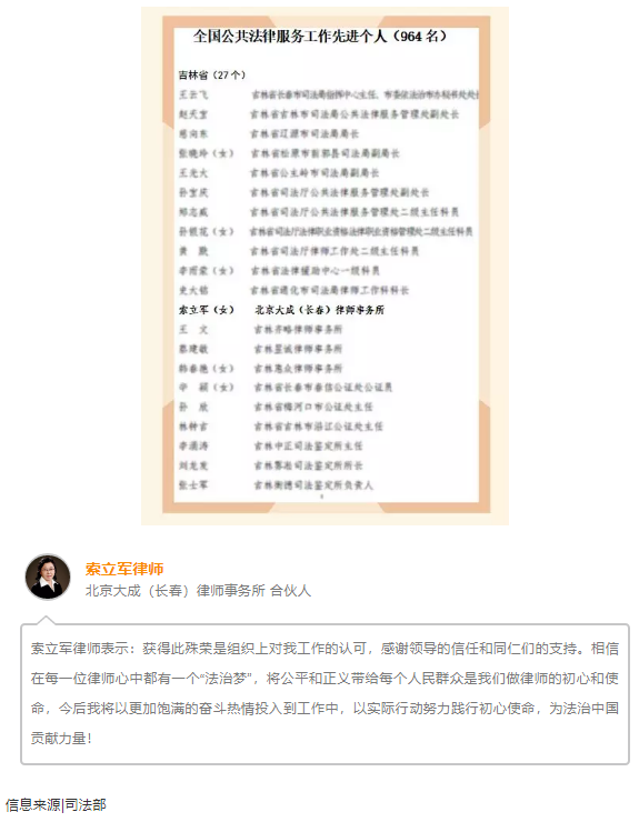 大成律师索立军获全国公共法律服务工作先进个人荣誉称号